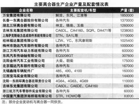 2007年我国共生产商用车250.1万辆,国内生产的汽车离合器大约在400多万套(OEM+售后+进出口差)。国产离合器由于技术水平和材质关系与世界先进水平相比还有一定差距,国内产品基本上满足了大多数商用车的需要。由于过去车辆超载严重,离合器容易损坏,更换率高,随着国内计重收费及限超载加严,超载现象将有所改变(但非公路车使用时仍有不少超载)。