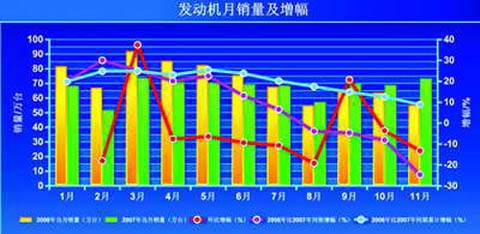 数据显示,进入2008年以后,发动机市场表现良好, 3月达到销售最高峰,单月销量突破90万台。在4月、5月保持了2个月的平稳运行后,从6月开始下跌趋势逐渐明显,7月环比下跌10.7%。此后,市场一直比较冷淡,7~11月,没有一个月单月销量达到70万台。