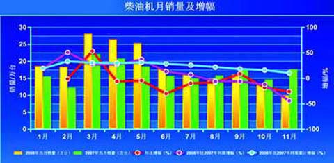 2008年6月,我国柴油机市场持续了3个月的繁荣期结束,出现大幅下跌,环比跌幅29.8%。此后,除9月外,其他几个月均为环比负增长。8月,柴油机销量下降幅度为5.8%,;10月和11月,同比下降幅度加大,分别达到12.2%和44.2%。去年11月,我国柴油机单月销量不足10万台,市场惨淡。