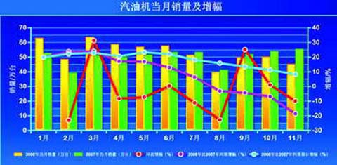 进入2008年下半年,市场出现疲软,全球金融危机对我国车市的影响逐渐凸显。7~11月,汽油机销量同比增幅与上半年相比大幅下滑,8月滑到谷底,仅销售39.5万台左右。其间,除7月仍保持6.4%的增长外,其余各月均为负增长,且下降速度较快。其中,11月同比下降约18.5%,销量为45万台左右,比除8月外的其余各月都低。