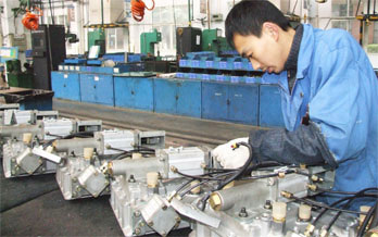 总装分厂装配工正在装配EPS系列变速器上盖中的气动阀配件