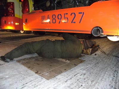 冒着零下30度的严寒对车辆进行检查保养