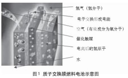 公交车氢电的转化,是通过电池产生的,质子交换膜燃料电池(示意图见图1)具有无污染、效率高、无噪声、工作温度低、可不间断工作等优点。相对其他形势的电池,PEMFC无需充电,只需添加燃料,即可继续运行,产生的唯一排放物是水,真正实现了零排放,能量转换率高达60%以上,实际使用效率则是普通内燃机的2~3倍。因此成为我们开发公交车的首选。