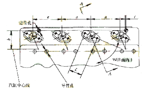 喷油孔的位置检验,用两只定位插销穿过检验模板在导管孔内定位,另一只检验插销逐个插检喷油孔的位置,如图4所示。喷油孔的位置精度和坐标尺寸均为自由尺寸要求,在加工中心上加工能适当提高坐标精度,把被提高部分的坐标精度和自由位置精度一并考虑,利用补偿原则确定检验插销的合适直径。检验模板上孔的坐标尺寸计算为