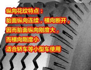 这种花纹共同特点是胎面纵向连续,横向断开,因而胎面纵向刚度大,而横向刚度小,轮胎抗滑能力呈现出横强而纵弱的特征。这种花纹轮胎的滚动阻力较小,散热性能好,但花纹沟槽易被嵌入碎石子儿。综合来看,这种型式花纹适合在比较清洁、良好的硬路面(如城市道路和高速公路)上行驶。例如,轿车、轻、微型货车等多选择这种胎纹。