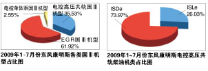 2009年1~7月份,在东风康明斯的EGR类国Ⅲ柴油机中,销量占有比重最大的是L系列,主要客户是东风、柳汽、安徽华菱;其次为B系列,占有20.98%的比重,主要客户是东风、湖北昌通;而C系列的比重为14.71%,主要客户是东风、襄樊客车。电控单体泵产品主要集中在B系列,以3、5、6月份销量较高。东风康明斯的电控高压共轨柴油机产品以ISDe的销量最大,ISLe次之。