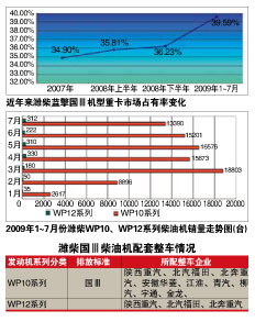 潍柴国Ⅲ标准柴油机的主力机型是排量为9.7L的WP10系列,该机型广泛配套于陕汽、福田、北奔、华菱、宇通、大金龙等,2009年平均月销量约13022台。排量为12L的WP12柴油机销量很小,今年1~7月份的平均月销量仅205台,主要配套于超大型豪华客车。但是我国大排量柴油机有向13L挺进的趋势,预计潍柴WP12柴油机将在两年之后上量。