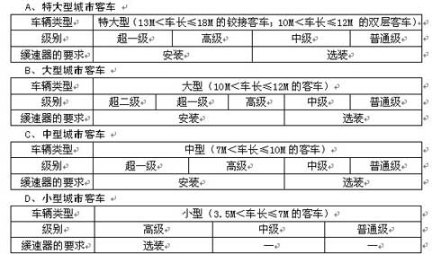 ② 建设部于2002年6月5日发布,自2002年10月1日起实施的CJ/T162-2002《城市客车分等级技术要求与配置》对是否安装汽车缓速器的要求如下:
