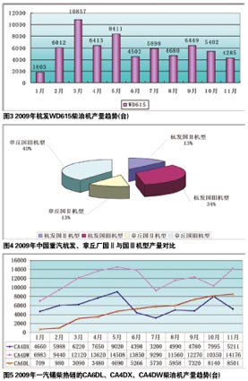 2009年,一汽解放锡柴热点众多,除CA6113、CA4113系列外,各功率段柴油机全面发力,其热销机型是CA4DX、CA4DW、CA6DL、CA6DF3F、CA4DF3F。上述机型产量占锡柴总产量的83%以上。在轻型柴油机中,尤其以CA4DX(排量3.142L、功率58~70kW)、CA4DW(排量2.54/2.16L,功率34~62kW)两款最为抢眼,2009年度该两款柴油机产量占锡柴总产量的40%以上。