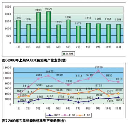 从机型看,东风康明斯在2009年的主销机型是C系列(功率162~239kW)、L系列(功率221~264kW)、B系列(分四缸机与六缸机,功率为92~173kW),国Ⅲ标准柴油机以ISDE为主。其中,L系列(月销量在2000~3600台之间)主要销往东风、华菱、宇通、一汽客车、金旅等;C系列(月销量在1150~1500台之间)主要销往湖北昌通、柳工、襄樊美标、江淮;B系列(月销量在2500~2900台之间)和ISDE(功率103~210kW,月销量在1150~1450台之间),主要销往东风、湖北朗通、襄樊美标、宇通、湖北昌通、柳工、苏州金龙、江淮、宇通重工、安徽合力。上述各系列EGR国Ⅲ机型销量比例一直较高。