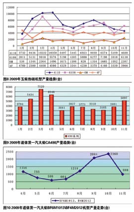作为合资公司,大柴生产的道依茨两款柴油机BF6M1013(排量7.146L,功率162~220kW)、BF4M2012(排量4.04L,功率90~118kW),一直受到行业的关注,但是这两款机型的销量波动很大。目前,道依茨两款柴油机主配一汽、青汽、黄海及宇通、一汽客车底盘等,且正在与徐工、三一重工、中联重科、山东临工、宝马格、阿特拉斯等工程机械配套。由图10可以看出,这两款柴油机6、7月份产量下降很大,8月之后上升,11月份又有较大幅度的下滑,显示出虽有顽强的增长潜力,但市场需求尚未稳定。