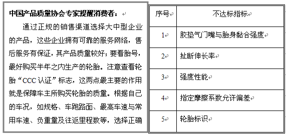 不合格汽车轮胎产品主要是胶垫气门嘴与胎身黏合强度、扯断伸长率、强度性能、指定摩擦系数允许偏差和轮胎标识等不符合规定或不达标。