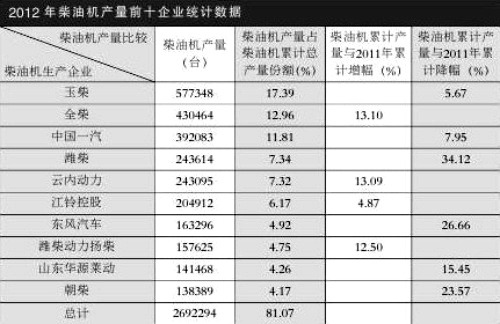 近日,2012年中国柴油机生产企业产销量排名公布,玉柴、全柴、中国一汽、潍柴、云内动力、江铃控股、东风汽车、潍柴动力扬柴、山东华源莱动、朝柴分别位居柴油机累计产销量的前十位。
