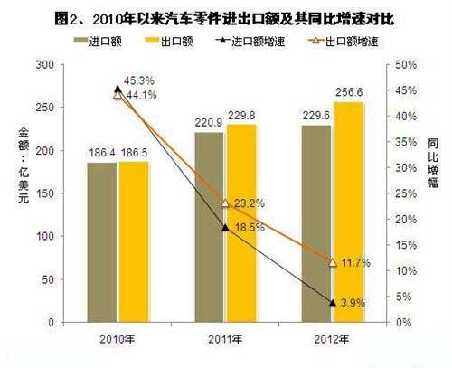 汽车零件贸易顺差扩大。2010年,汽车零件出口额仅比进口额高0.1亿美元,2011年贸易顺差增大至8.9亿美元,2012年扩大至27.0亿美元。