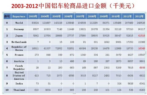 按查询结果,铝车轮及相关商品进口额由2003年的0.8亿美元增加到2012年的2.5亿美元。(如下图) 出口额方面,近10年,铝车轮及相关商品出口额增加近8倍,由2003年的5.3亿美元增加到2012年的40.5亿美元。(如下图)