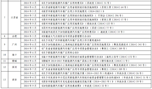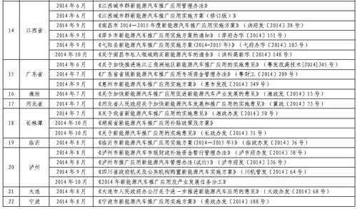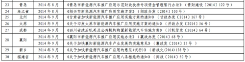 2014年11月21日,工信部发布了《新能源汽车推广应用示范城市(群)配套政策出台情况公示》。据工信部统计,截至2014年10月底,有30个城市(群)65个城市出台了新能源汽车推广应用配套政策措施。