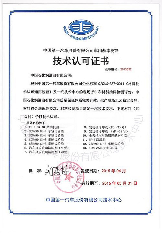2015年7月6日,中国石化润滑油有限公司北京研究院收到中国第一汽车股份有限公司技术中心发来的车用基本材料技术认可证书。长城CF-45W-40柴油机油、80W/90GL-4车辆齿轮油、85W/90GL-4车辆齿轮油、75W/90GL-5车辆齿轮油、80W/90GL-5车辆齿轮油、85W/90GL-5车辆齿轮油、汽车风窗玻璃清洗剂(Ⅴ型)、汽车风窗玻璃清洗剂(Ⅶ型)、发动机冷却液(FD-35号)、发动机冷却液(YF-35号)、全天候汽车通用锂基润滑脂、HP-R润滑脂、4529冷冻剂油46号共13种获得技术认可。