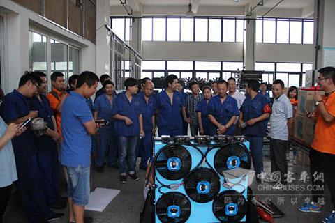 此次重庆站活动分两部分。第一部分是在两江公交维修会议室进行活动介绍和水箱换装现场培训。通过丰富的ppt和通俗易懂的讲解,驿力科技市场部经理为各参赛队形象介绍了水箱换装步骤,并现场演示了所用工具,回答了参赛者的疑问。第二部分是在两江公交维修车间进行水箱换装竞赛。正式比赛开始之前,各参赛队进行了简单抽签仪式,确定出场顺序。各参赛队都是公交维修一线具有丰富工作经验的技师,对刷新最短时间记录充满信心。