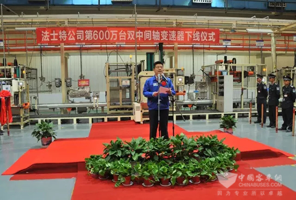 从1985年开始生产到第100万台变速器下线,共用了22年时间。从100万台到今天的第600万台下线,仅用了8年零8个月时间。严鉴铂董事长强调,下线的第600万台变速器,是企业对标欧美、面向国际自主研发的S12档双中间轴全铝合金变速器,该产品具有重量轻、噪音低、轴向尺寸短、速比级差小、操纵轻便、爬坡能力强、燃油经济性好等领先优势,代表着法士特制造、法士特创造的独特魅力,备受用户青睐和热捧,市场需求增势迅猛,为企业始终坚持大战略规划、大市场拓展、高水平定位和国际化发展注入了强劲动力。