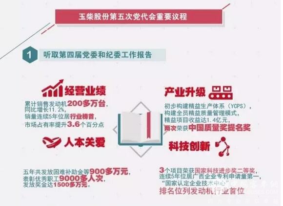 报告对过去五年的工作进行了总结。报告指出,过去五年,玉柴股份党委紧密围绕公司中心工作,促进公司转型发展;累计销售发动机200多万台,同比增长11.2%,销量连续5年位居行业榜首,发动机市场占有率提升3.6个百分点;“柴油机低噪声设计关键技术及应用”等3个项目荣获国家科技进步奖二等奖,连续5年位居广西企业专利申请量第一,“国家认定企业技术中心”排名位列发动机行业首位;初步构建精益生产体系(YCPS),构建全员精益质量管理模式,精益项目收益达1.4亿元,两次荣获中国质量奖提名奖;加强海内外合作,开启玉柴高、中、低转速大马力机型的全面发展局面,推动玉柴发动机品牌向全球高端产品跃进。