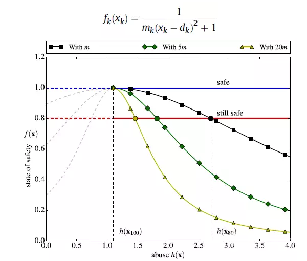 可以将安全函数计算公式设为如下模式,其中g(x)为滥用函数,当g(x)趋向无穷大的时候,安全函数趋向0,表明电池极度不安全,而滥用函数g(x)为0的时候,电池完全没有滥用,因此电池安全函数值为1,表明电池是完全安全的。