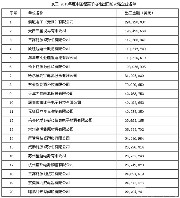 2015年锂离子电池出口量14.91亿只,2014年出口量13.22亿只,同比增长12.8%。2015年出口额64.94亿美元,2014年出口额54.75亿美元,同比增长 18.6%。