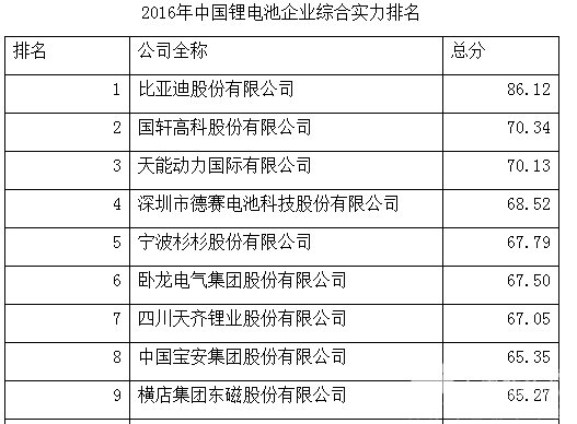 《2016年中国锂电池企业综合实力排名》榜单出炉 比亚迪第一