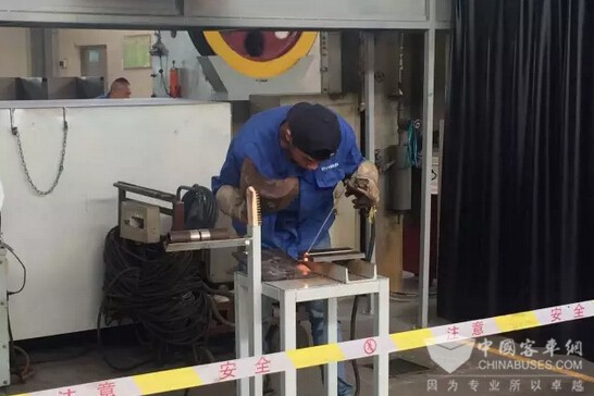 最后一个技能比武项目是封装车间的焊工比武。领导们拿着手持防护罩仔细观察,点评。参赛者们三人一组进行比赛,每人要完成板材和管材焊接各一个。火花四溅中映照出他们专业、敬业的精神。赛后成绩由大师工作室成员,三届技术名将和具有丰富经验的权威焊工们,依据二十多项评定标准,与选手们的作品进行一一比较,最终决出优胜。