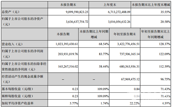 国轩高科(002074)2016年10月26日晚间公告,公司前三季度实现营业收入34.23亿元,同比增长128.37%;净利润7.38亿元,同比增长122.09%,基本每股收益0.84元。