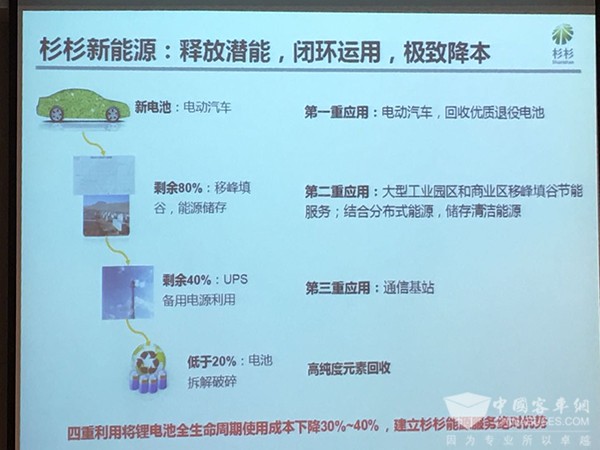 比如刚才提到的锂的回收,我特意写了一个锂的回收,锂的回收或者不会受可能也是因为价位的因素造成的,为什么?去年或者更早的时候碳酸锂的价位四五万,回收锂不合适,费用比较高,没必要去回收,但是疯涨的情况下大家没办法都回收了,甚至好多做磷酸铁锂的电池、磷酸铁锂的肥料,因为本身磷酸铁锂不值钱,里面有锂,大家拿磷酸铁锂去回收锂,也形成了一个小的产业,这也是因为一个很无奈的事情,所以说做的一些更无奈的事情。包括我们回收的一些布局,我们也会在宁夏去做一些废电池的回收,包括我们要做一些事情。这种梯级利用实际刚开始我们各位专家都提到过,我们杉杉也有下属的公司单独的公司去运作梯级利用、回收的事情,就不详细介绍了。