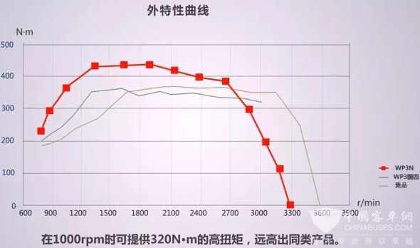 额定功率118kW,升功率39.7kW/L,最大扭矩450N.m/(1400-2200)rpm,升扭矩达到151N.m/L,是一款高端轻型柴油机。在1000rpm时可提供320N.m的高扭矩,远高出同类产品。