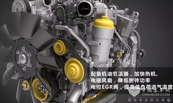 配备机油节温器,加快热机,电磁风扇,降低附件功率;电控EGR阀,提高低负荷进气温度。