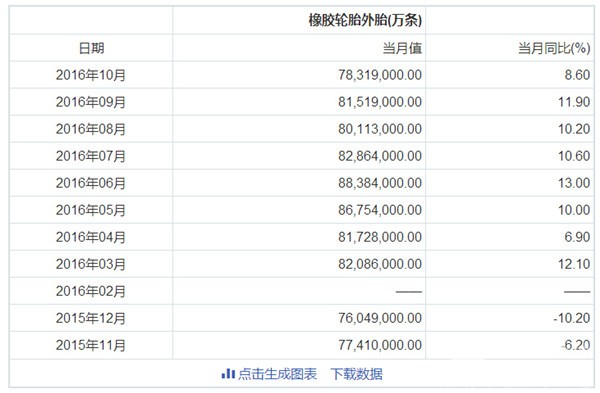 2016年10月我国橡胶轮胎外胎产量同比增长8.6%