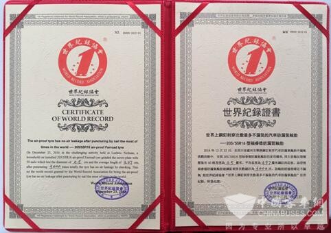 这项世界纪录名称为《世界上钢钉刺穿次数最多不漏气的汽车真空轮胎---205/55R16型福睿德真空轮胎》。