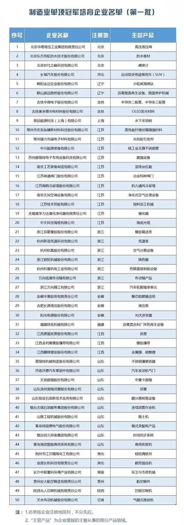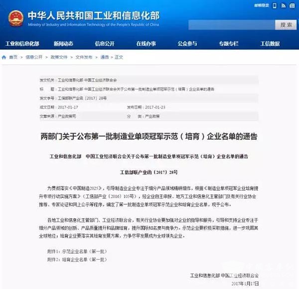 近日,工业和信息化部、 中国工业经济联合会公布了第一批制造业单项冠军示范(培育)企业名单。文件明确指出各地工业和信息化主管部门、工业经济联合会,有关行业协会要加强对企业的指导和服务,引导和支持企业专注于细分产品领域的创新、产品质量提升和品牌培育,提升国际知名度与竞争力。示范企业要积极采取措施,进一步巩固其全球地位;培育企业要落实其培育发展方案,力争尽早发展成为全球领先企业。