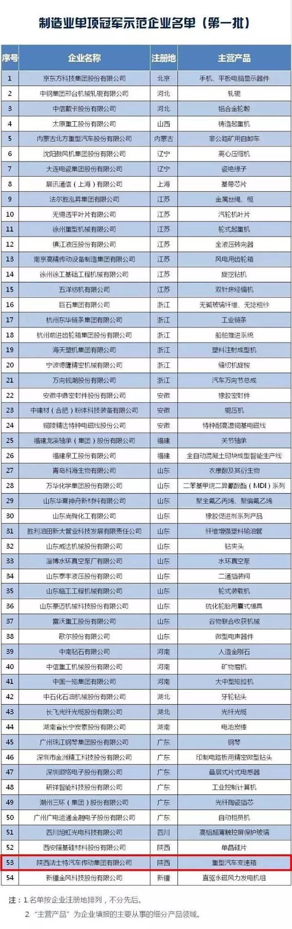 此次公布的首批制造业单项冠军示范企业54家,培育企业50家。其中,陕西地区示范企业2家,培育企业1家。法士特集团凭借重型汽车变速器产销行业领先的优异成绩,顺利入选国家工业和信息化部首批“制造业单项冠军示范企业”,充分彰显了公司的行业影响力和品牌魅力。