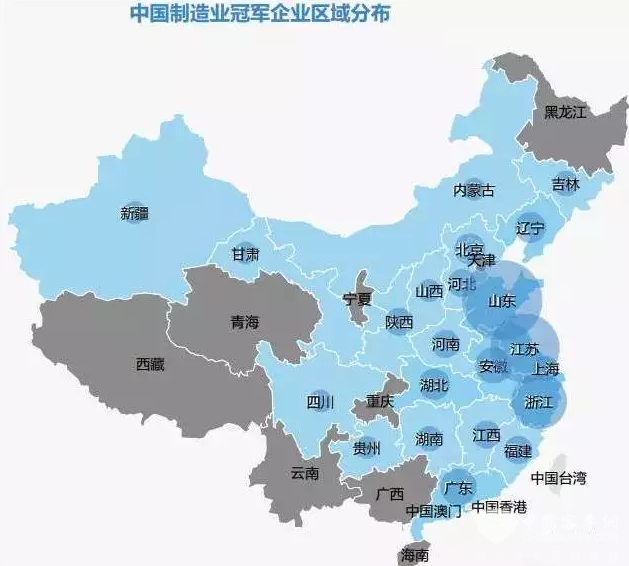 在中国制造业冠军企业区域分布图中,灰色地区未有企业入围冠军企业,共计9省区,包括广西、云南、黑龙江、重庆、天津、海南、宁夏、青海、西藏等地,除黑龙江、宁夏外主要分布在西南地区。有入围企业的省市在图中用圆圈大小表示冠军企业数量,山东、江苏、浙江以22家、18家、13家占据三甲位置,广东、安徽各有6家企业入选。入选4家企业的有湖北、辽宁、北京。河南、陕西、河北、福建、江西以3家企业紧随其后。上海、湖南、吉林各有两家企业入选。有一家冠军企业的有内蒙古、四川、山西、新疆、甘肃、贵州。