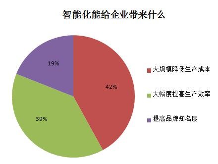 结果显示,42%的人认为,智能化可以降低企业生产成本;39%的人认为,智能化可以大幅提高企业生产效率;其余19%的人认为,智能化可以提升产品竞争力。