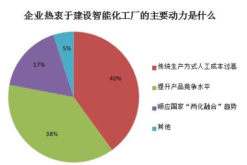 结果显示,40%的人选择传统生产方式成本过高;38%的人选择提升产品竞争力;17%的人选择顺应国家“两化融合”趋势;另有5%的人选择其他。