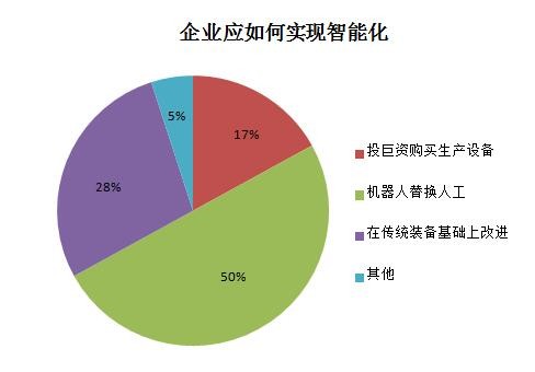 调查显示,对于如何实现智能化这个问题,有一半的业界人士选择机器人替换人工。