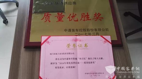纯电动系列产品仅2017年的第一季度订单数就已经过万,产品故障率低,性能优越,产品质量在同行业排行第一。就在前段时间,福工在中通百余家供应商中脱颖而出,成为中通客车2016年年度优秀供应商,并获得了质量优胜奖。