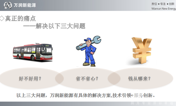 针对以上三个问题,我们万润有具体的解决方案,那就是:技术引领+服务创新。在服务方面,包括整个车辆的售前、售中、售后服务,以及金融方面的服务。通过技术引领我们可以降低整车的电耗,也就是可以降低整车成本,通过服务的创新提高客户的满意度,让客户用车无忧。