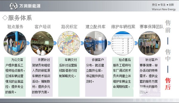售中服务,当公交公司选好一款车型以后,我们可以协助车厂来进行整个动力的匹配,以及在安装过程当中装配人员的培训,还可以协助整车厂生产人员进行车辆标准化的装配。同时建立车辆全生命周期档案。