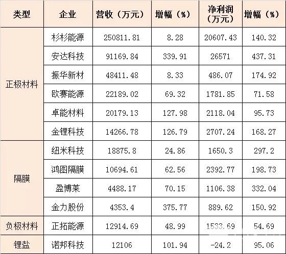 整体来看,受益于新能源汽车和动力电池市场的升温,材料企业的业绩利润都出现了明显的增长,10家企业中,营收增幅超100%的有5家,净利润增幅超100%的有7家。