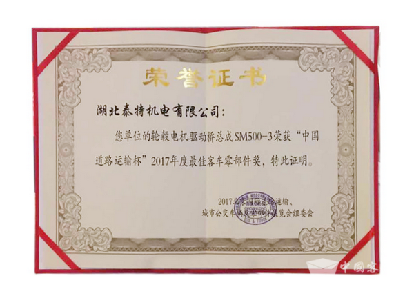前不久在“2017北京国际道路运输、城市公交车辆及零部件展览会”中,湖北泰特机电有限公司研发的轮毂电机驱动桥总成SM500-3荣获“最佳客车零部件奖”。