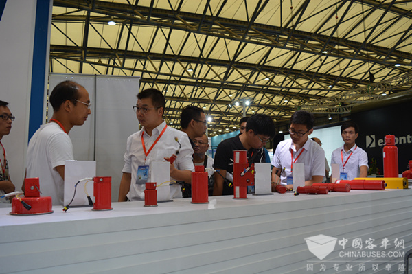 本届客车展,世纪联保展出了锂电池箱专业自动灭火器装置和脉冲超细干粉自动灭火器装置以及各类启动部件,产品更加突出了节能性和安全性。在节能方面,针对新能源客车,市面上常见的自动灭火装置使用的是传统的一个大箱体,把灭火装置装入箱体内,这样整体的重量是很重,不利于整车的轻量化和节能性。而世纪联保的灭火装置,实现了去掉外箱,单体安装,这样减少了装置自重,同时也减轻了车辆的负载。