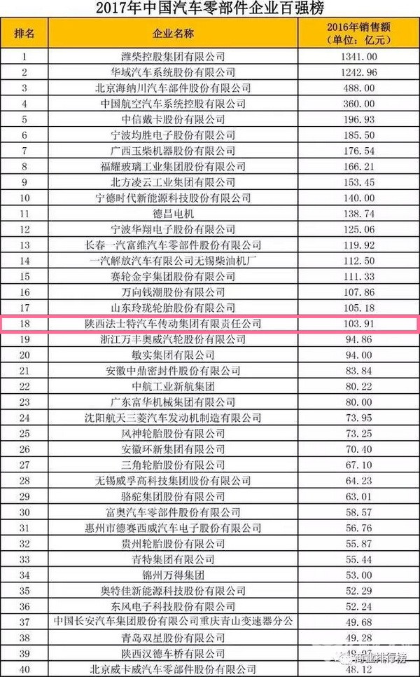 法士特荣登2017中国汽车零部件企业百强榜
