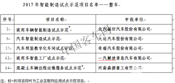 1.从整车角度来看,“2017年智能制造试点示范项目”更注重客车、卡车、专用车等商用车的示范作用,而“2017年智能制造综合标准化与新模式应用拟立项项目公示”则在整车方面只有一项,而该项目去年同期更关注客车智能化和柔性生产(详见《补贴退坡 智能升级 新能源客车产业链政策支持新导向》)