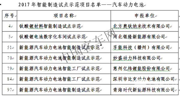 2.从新能源汽车的核心零部件动力电池来看,两个项目飞动力电池企业项目比重都较大。相比较而言,“2017年智能制造综合标准化与新模式应用拟立项项目公示”更关注正负极原材料和电池产能,“2017年智能制造试点示范项目”则稍微笼统一点,但对钛酸锂这一负极材料和相对应的技术路线给予了重视(详见《工信部又㕛发布智能制造项目,动力电池14+7有内涵》)。