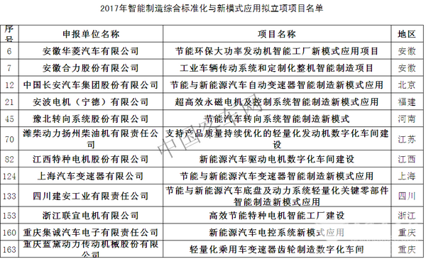 相比较而言,“2017年智能制造试点示范项目”更侧重生产方面的智能化,而“2017年智能制造综合标准化与新模式应用拟立项项目公示”更具象更明晰,尤其在汽车轻量化以及电机驱动系统的智能制造项目给予了较大的项目份额。